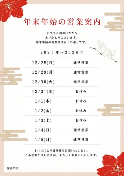 ※新年は、令和8年1月4日(日)10:00より通常営業開始いたします。